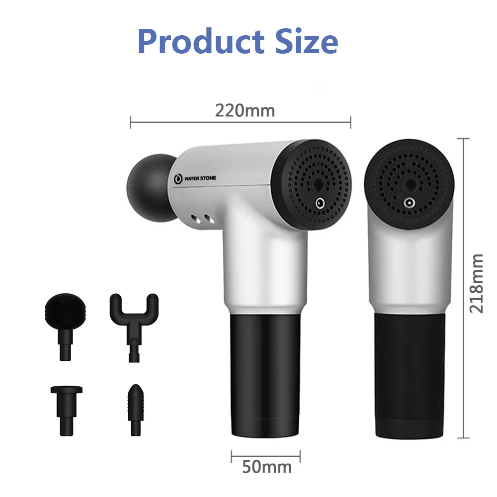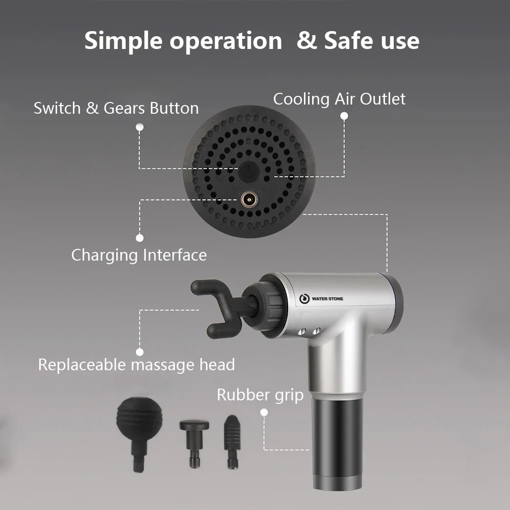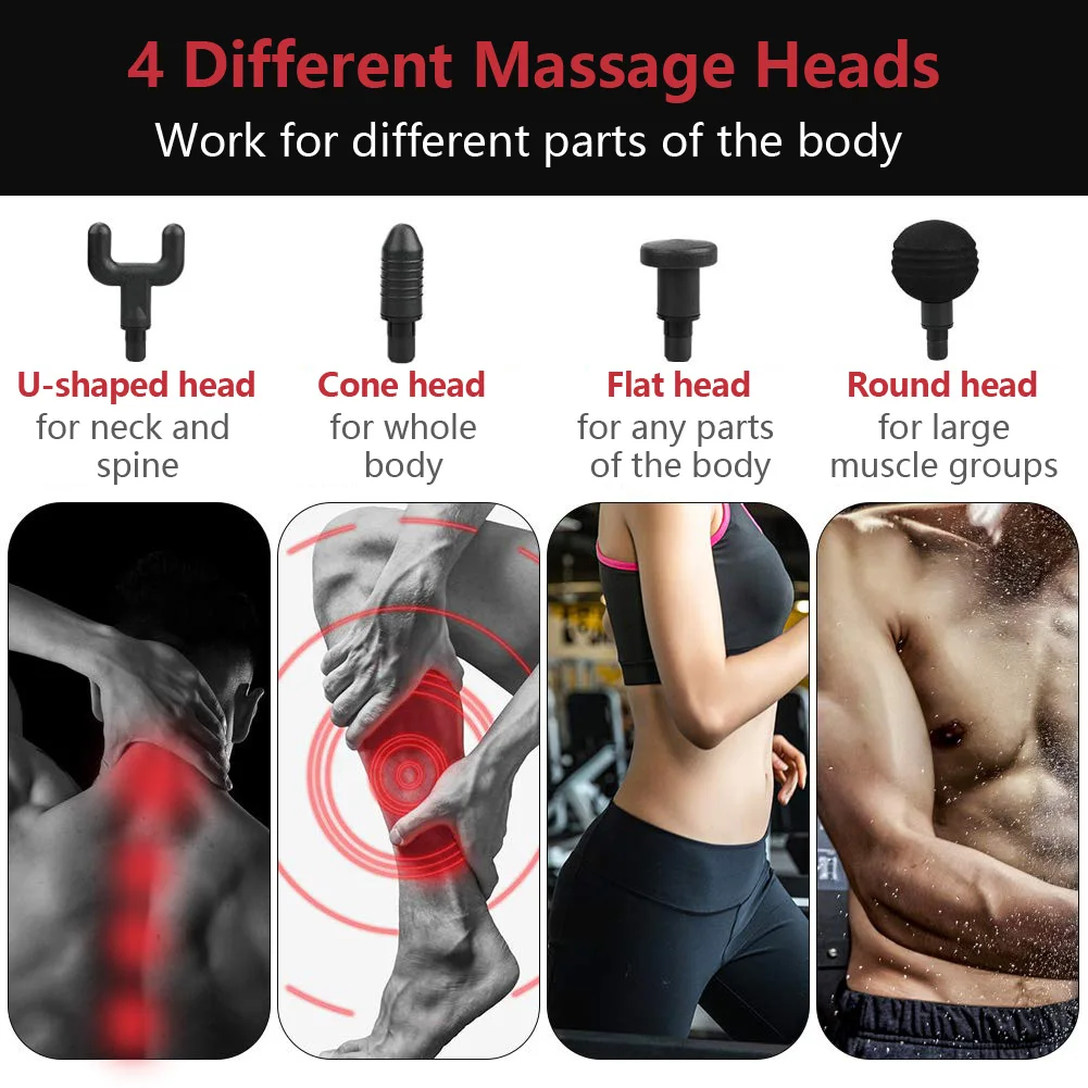 Массажер оснащен 4 различными массажными головками, которые могут помочь пользователю расслабить различные мышечные ткани. Такие как: большие группы мышц, массаж глубоких тканей, расслабление мышц, массаж шеи, позвоночника и Ахилла, небольшой диапазон расслабления мышц, массаж мышц икры или руки, быстрое облегчение спины, руки, ноги, ягодицы, плечи, шея, позвоночник и пяточная мышечная боль или мышечная усталость, быстрое восстановление, Также может помочь больным с атрофией мышц.