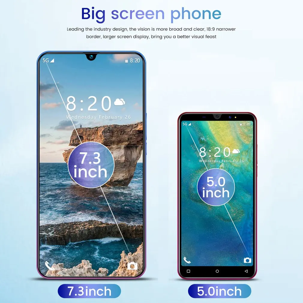 Особенности: 1. Аккумулятор: Универсальный смартфон, аккумулятор большой емкости, длительное время работы в режиме ожидания. 2. Технология: Интеллектуальное распознавание лиц, усовершенствованный процессор. 3. Структура: стильный внешний вид, плавные линии. Описание: Это P40 Pro 7,3 дюймовый телефон, Hd экран Water drop; Android smart мобильный телефон. Характеристики: Модель:P40 Pro(7,3 дюйма) Тип: США, ЕС, Великобритания, Австралия (необязательно) Разрешение: 720*1560 пикселей Цвет: черный, синий градиент, синий (по желанию) Память: 2 Гб RAM + 16 Гб ROM Мультимедиа: MP3 / MP4 / 3GP / FM-радио/Bluetooth Пиксели: фронтальная камера 2 миллиона пикселей, диафрагма f/2,0, фиксированное фокусное расстояние, задняя камера 5 миллионов пикселей (цветная, диафрагма f/1,8) Автофокус Язык: Поддержка нескольких языков Система: Android 6,0 Аккумулятор: внешний аккумулятор, емкость аккумулятора 3300mAh Посылка входит: 1 * Мобильный 1 * зарядная головка 1 * кабель для зарядки 1 * наушники 1 * Мобильный телефон Чехол 1 * фольга 1 штырь для карты 1 * Инструкция