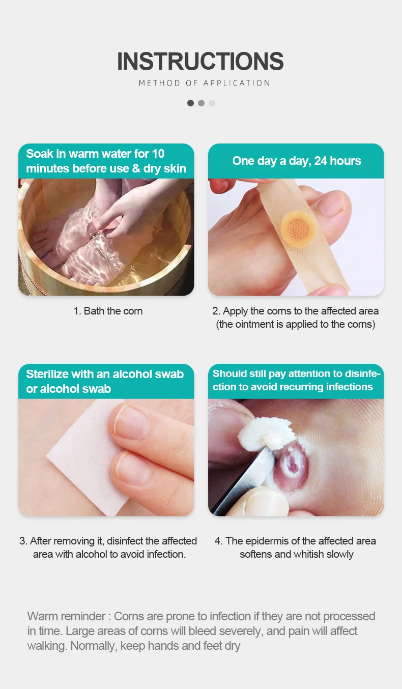 Замочите в теплой воде в течение 10 минут перед использованием и сухой кожи 1. Ванна кукурузы Один день в день, 24 часа 2. Нанесите мозоли на пораженный участок (мазь наносится на мозоли) 3. После удаления. Дезинфицируйте пораженный участок спиртом, чтобы избежать инфекции. 4. Эпидермис пораженной области смягчается и медленно мигает