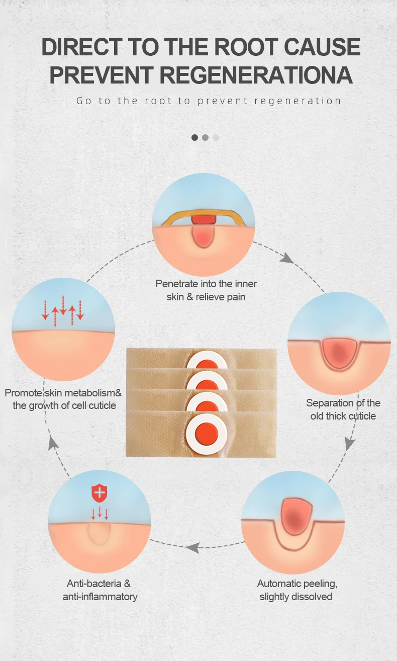 1. Проникает во внутреннюю кожу и снимает боль. 2. Разделение старой толстой кутикулы 3. Автоматический пилинг, слегка растворенный 4. Анти-бактерии и противовоспалительные 5. Способствует метаболизму кожи и росту кутикулы клеток