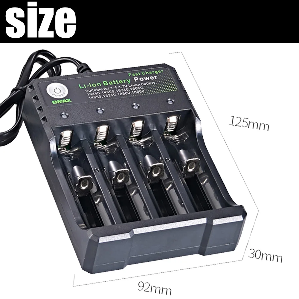 Характеристики:Название: литий-ионное зарядное устройство с 4 слотамиВходное напряжение: 5 В постоянного тока 1-2A USB портВыход напряжение: DC 4,2 V 1000mAРазмер: 15 см * 9 см * 3 смВес: 106 гСертификация: ЕС CE/EMC сертификация, США FCCСовместимая модель аккумулятора: 10440 14500 16340 1665014650 18350 18500 18650Особенности:Умный чип, быстрая зарядка;Защита от перезарядки;Защита от перегрузки;Защита от перегрузки по току;Обратная защита;Защита от короткого замыкания.