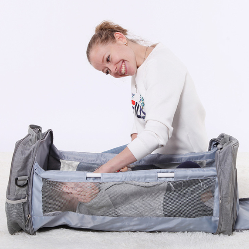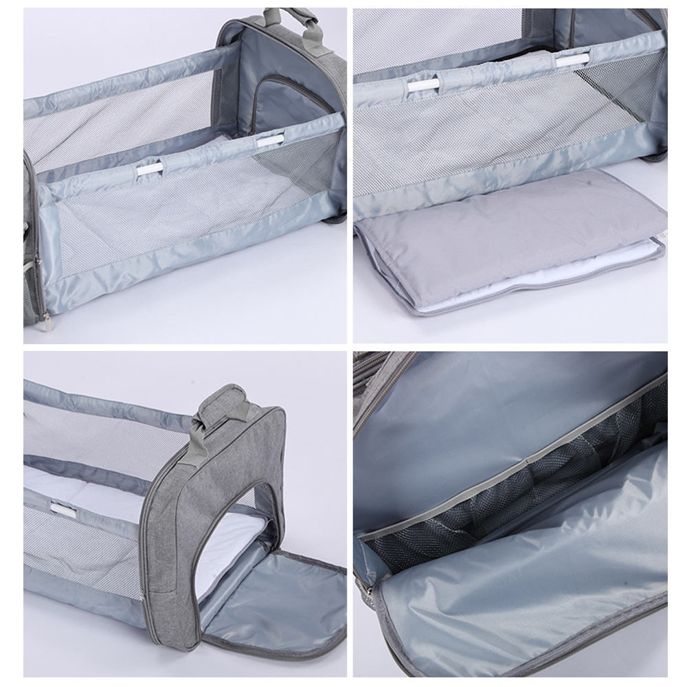 -Это сочетает в себе как дорожную кроватку, мешок для подгузников и портативную детскую станцию для переодевания все в одном!