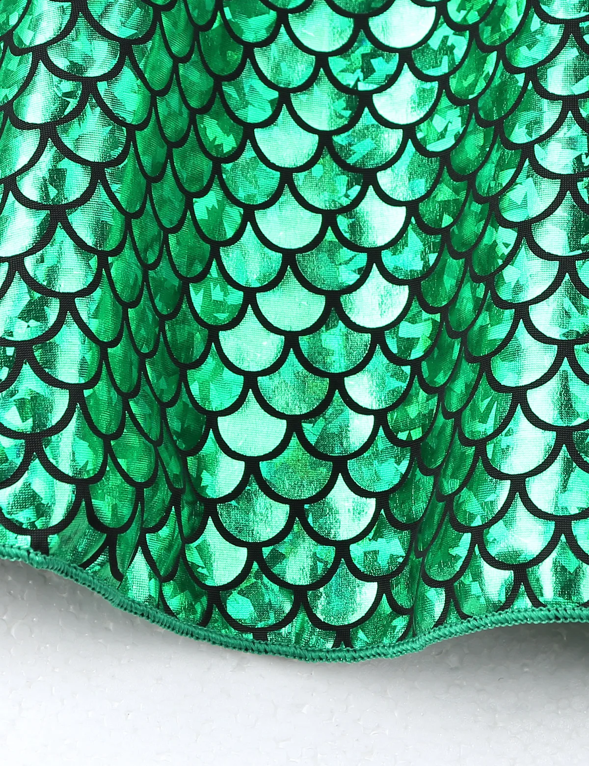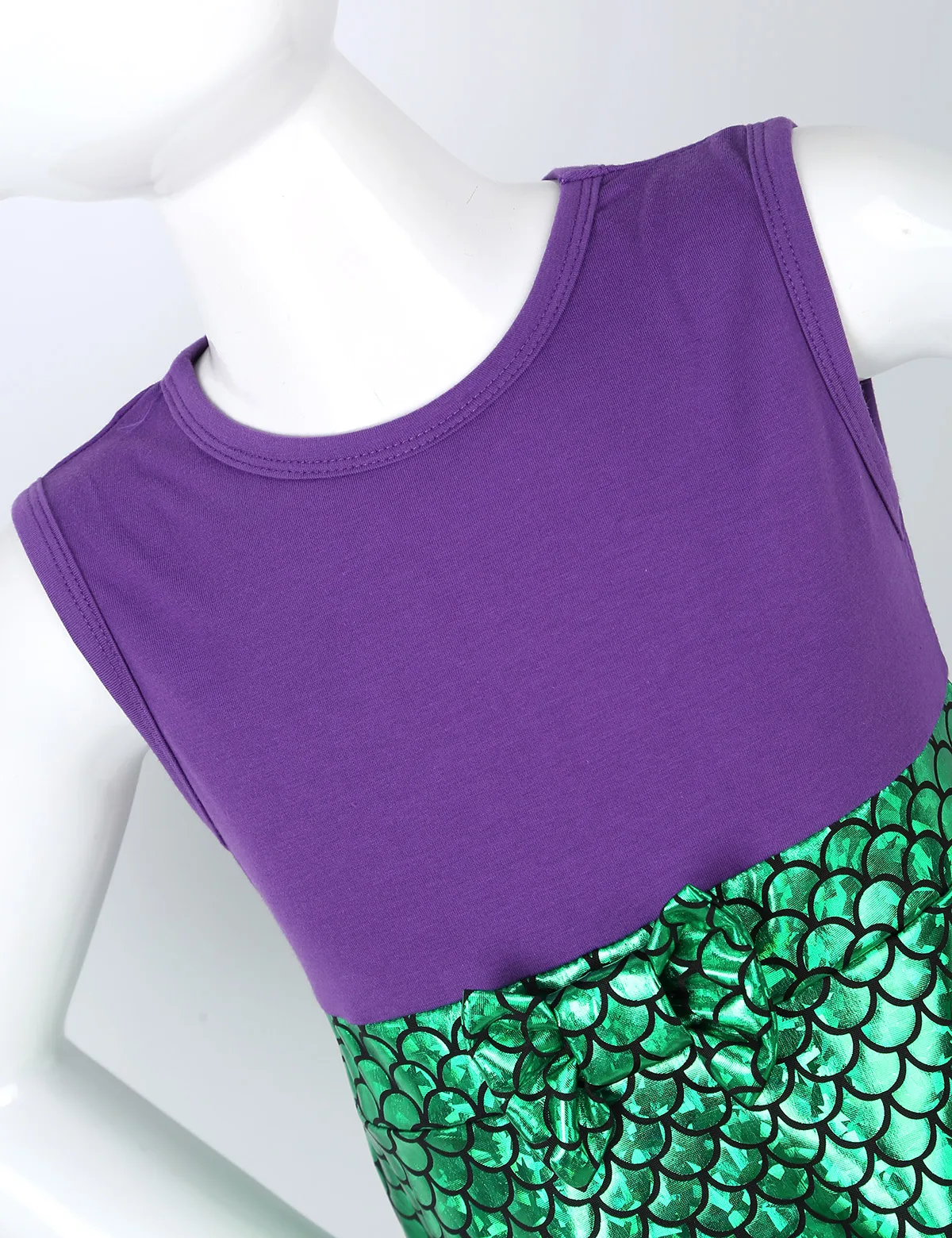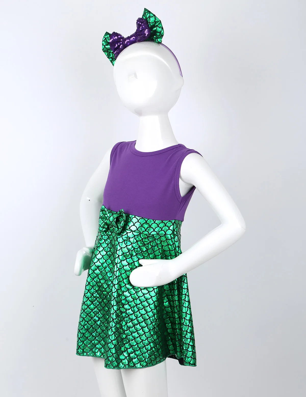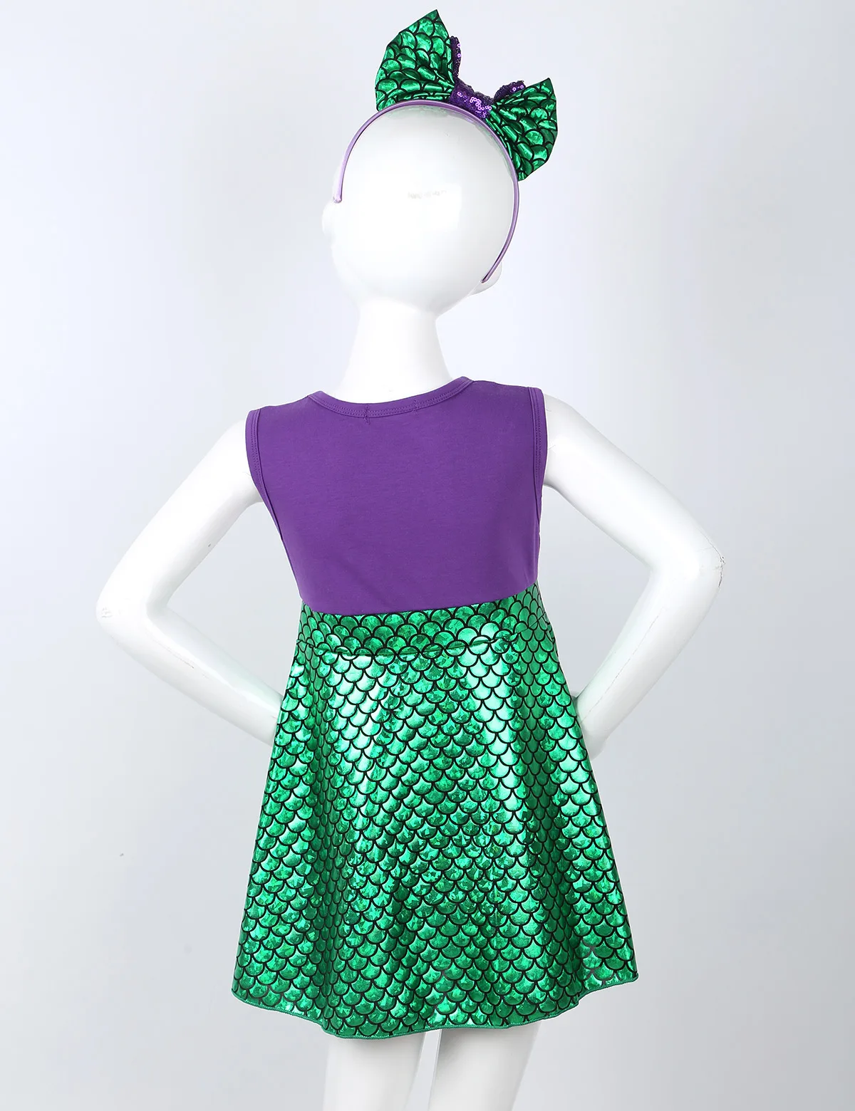 Без рукавов, с круглым вырезом. Дизайн с высокой талией и бантом. Затяните на застежке. Юбка с принтом рыбьей чешуи; Трапециевидный стиль.