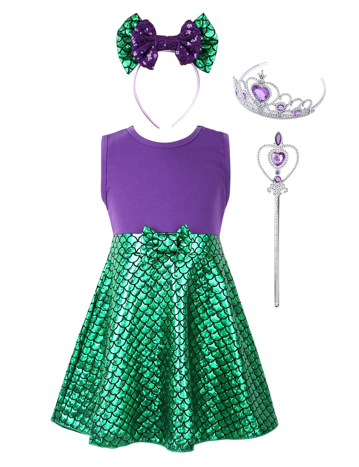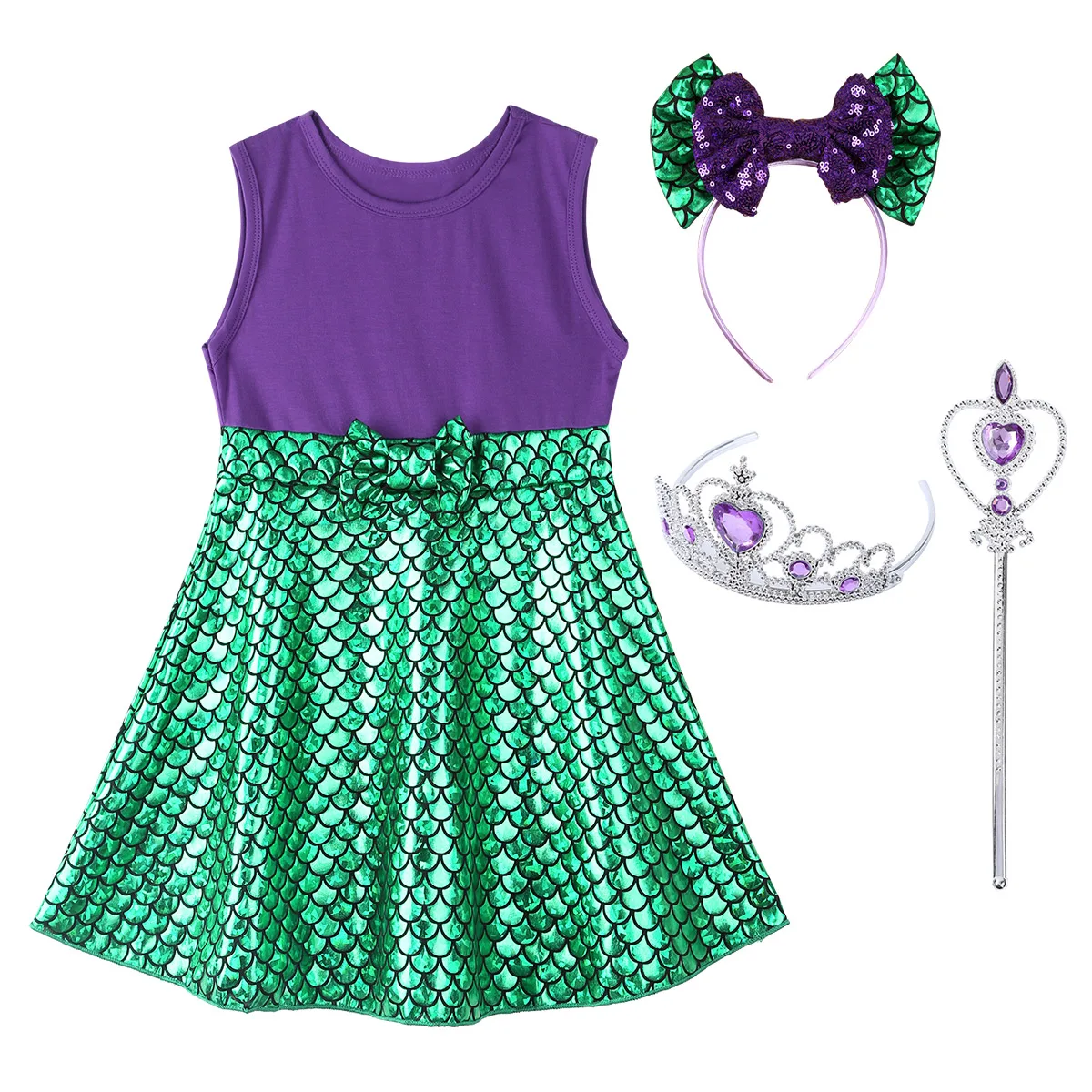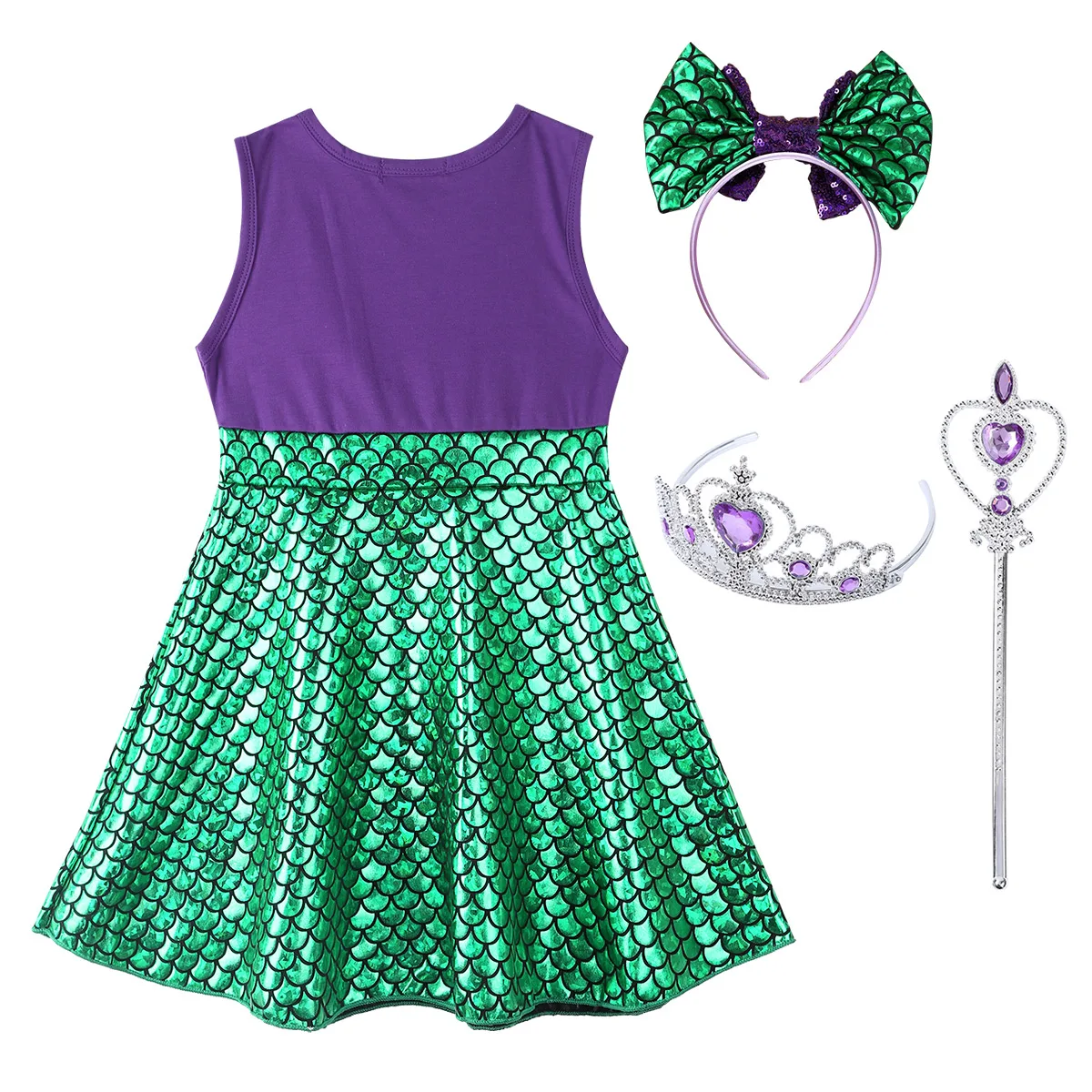 Комплект включает в себя: 1 платье русалки, 1 корона, 1 волшебная палочка, 1 обруч для волос