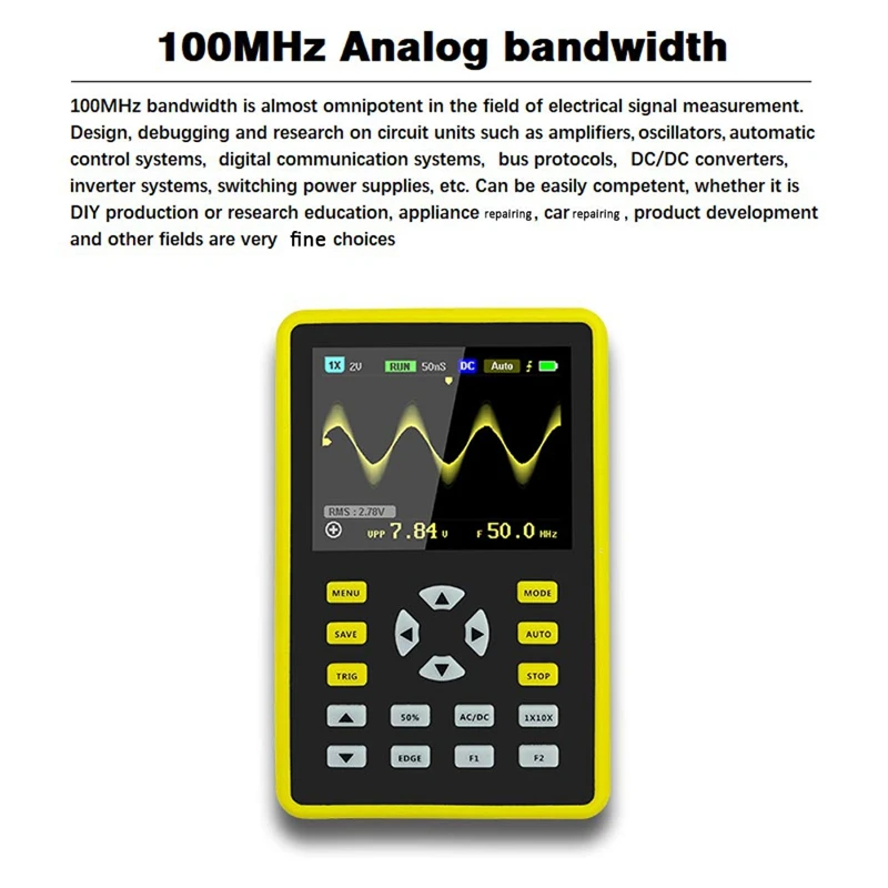 С аналоговой пропускной способностью 100 МГц и частотой дискретизации 500 мс/с. (1X = 5 МГц, 10X = 100 МГц)