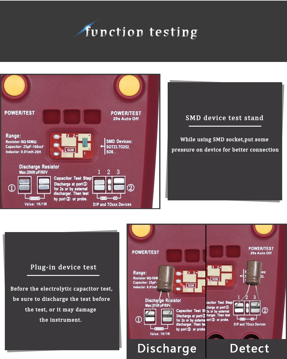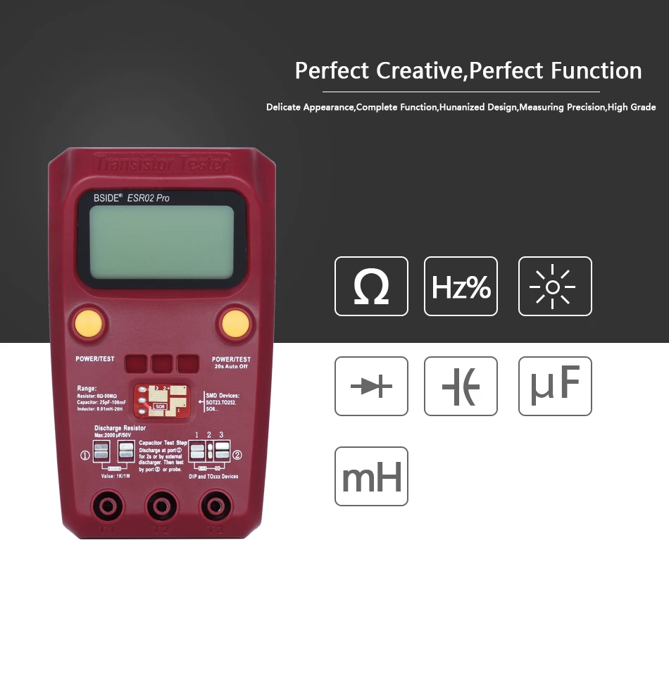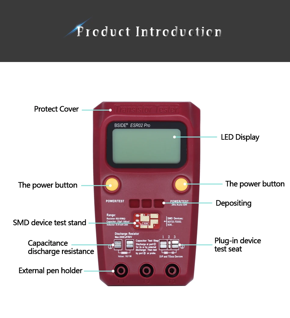 Очень легко тестировать подключаемые и SMD устройства, также могут тестировать различные виды диодов, триодов, тиристоров, МОП-транзисторов, позволяют анализировать тип устройства, полярность штыря, выход HFE, напряжение клапана, емкость соединения FET.