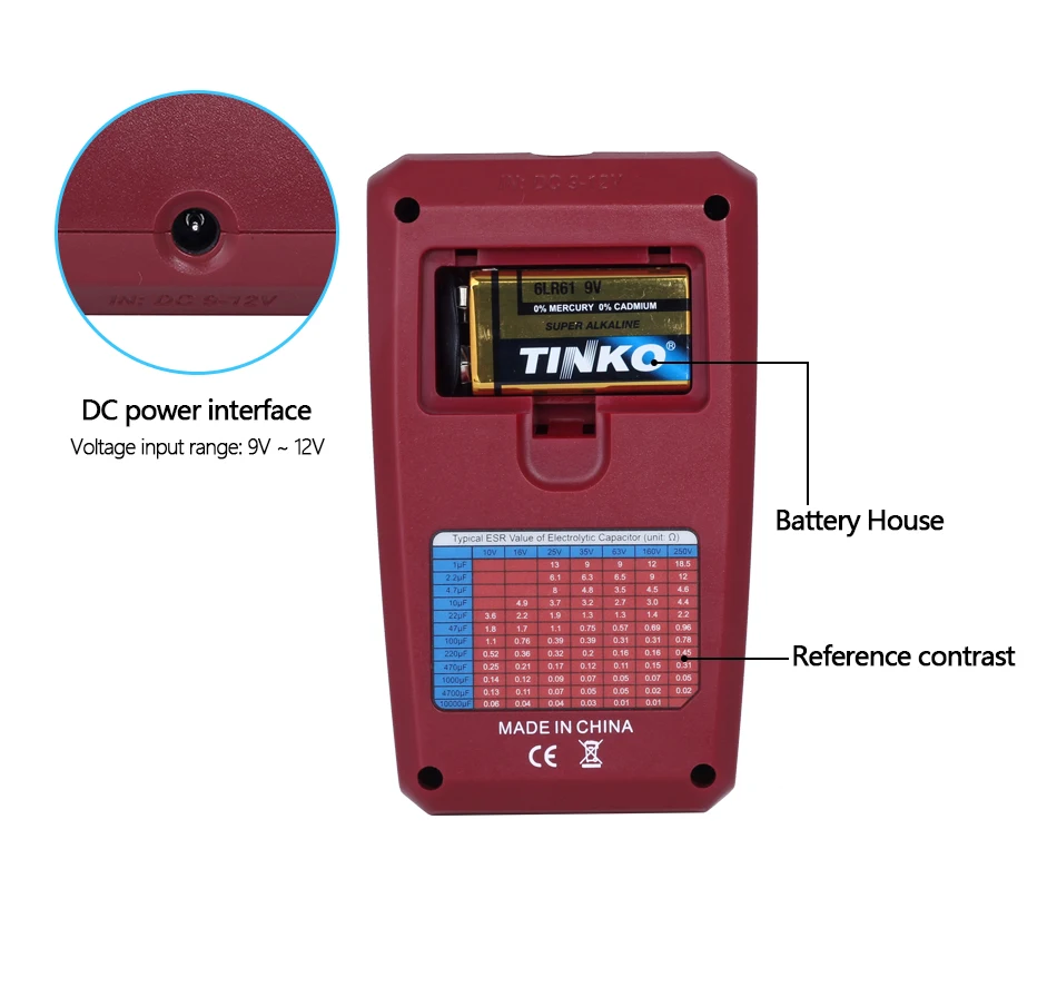 Может питаться от аккумулятора 9 в 6LR61 (не входит в комплект), когда питание аккумулятора составляет менее 6 в, замените новый.