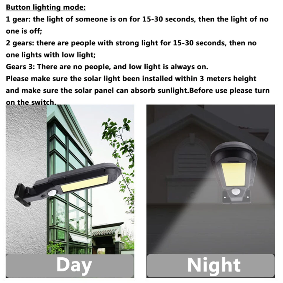 Пожалуйста, убедитесь, что солнечный светильник установлен в пределах 3 метров высоты и убедитесь, что солнечная панель может поглощать солнечный светильник.