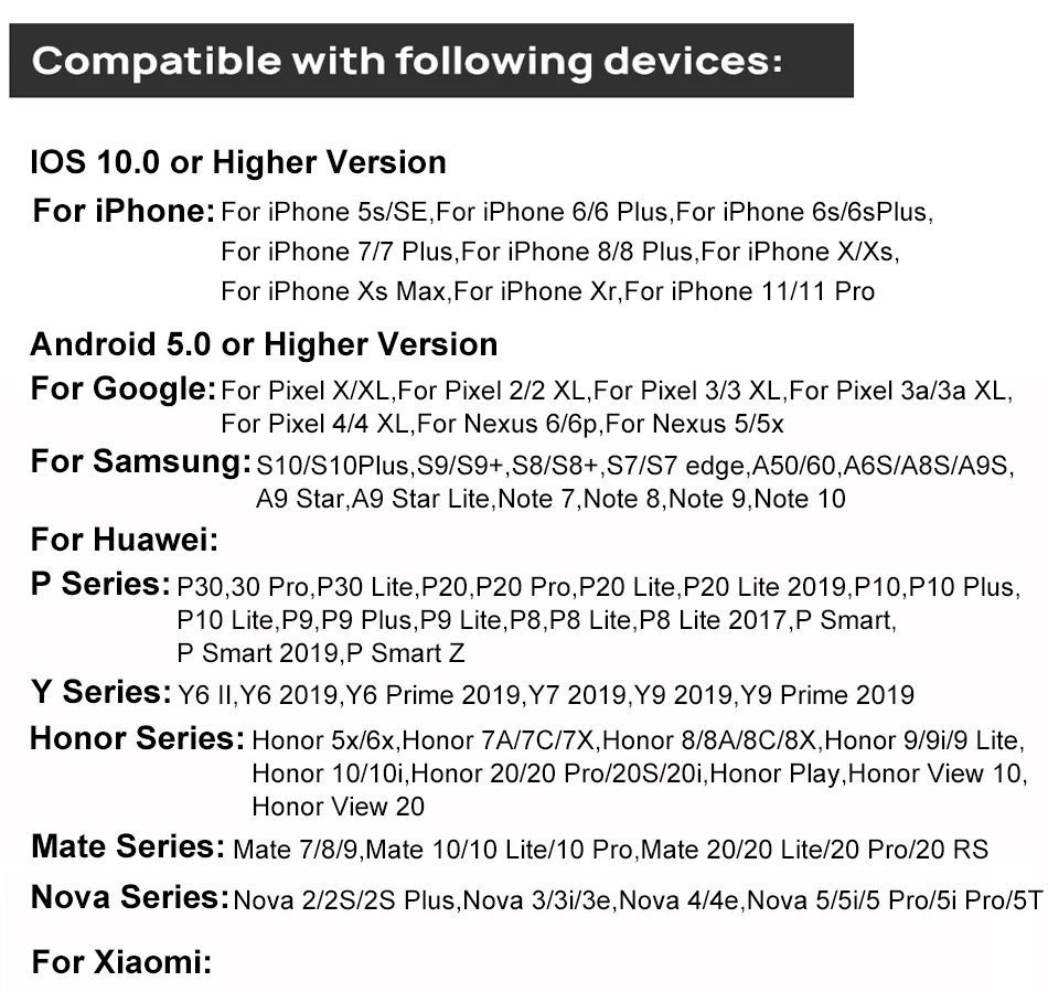 6. Он поддерживает android 5,0 или более новый смартфон. И IOS. 10,0 или более новый (например, iphone 5s ,iphone6/7/8/s/plus,iphone X/Xs/Xr/Max)