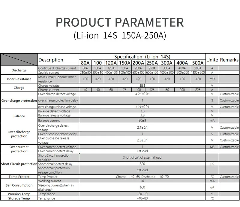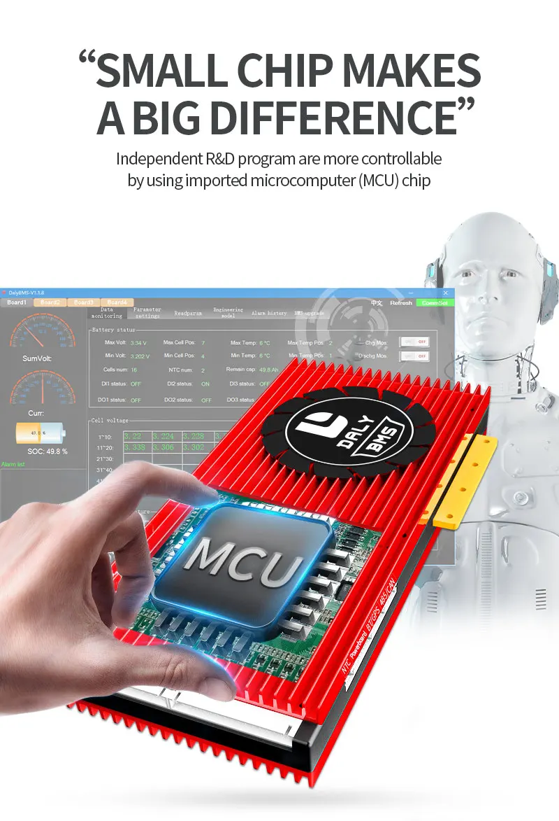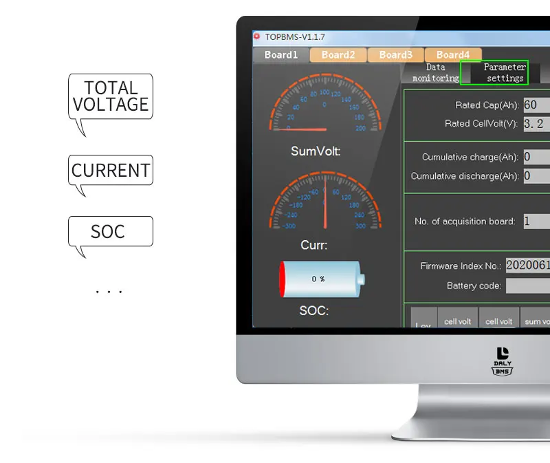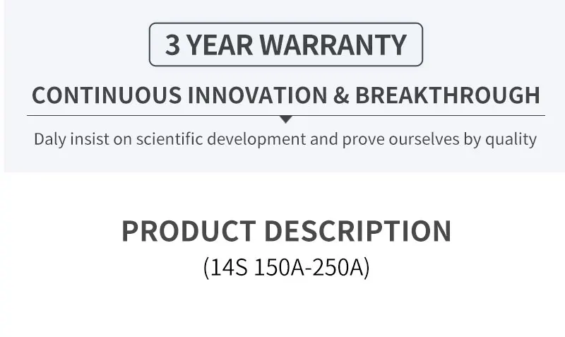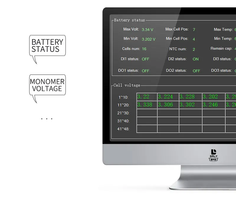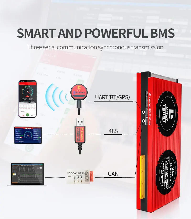 Daly 18650 smart BMS 14S 48V 150A 200A 250A Bluetooth 485 к USB устройству CAN NTC UART программное обеспечение Li-on плата защиты батареи BMS ◆ В настоящее время все умные BMS без водонепроницаемой функции. ◆ Эта ссылка для литий-ионного аккумулятора 14S 48V. Пожалуйста, заполните параметр после размещения заказа, чтобы обеспечить SOC правильной информацией. По крайней мере, ответ должен быть отправлен нам Aliexpress центром сообщений. Спасибо за понимание. Особенности ◆ UART: это обычный продукт Daly. UART является универсальным асинхронным приемником/передатчиком, он трансформирует данные для передачи между последовательной связью и параллельной связью. Как чип для преобразования параллельных входных сигналов в серийные Выходные сигналы, UART обычно интегрируется в другие коммуникационные интерфейсы. ◆ RS485: Пожалуйста, выберите модель RS485 Daly. RS-485 принимает сбалансированную передачу и дифференциальный прием, поэтому он имеет способность подавлять помехи в обычном режиме. ◆ Модуль Bluetooth: если вам нужна эта функция, пожалуйста, выберите модуль bluetooth, если вы не покупаете его, мы не отправим его вам. ◆ Ниже аксессуары нужно купить отдельно. 1.USB к UART кабель 2.USB к RS485 кабель 3. Модуль Bluetooth 4. Панель дисплея питания (активация ключа) 5.BMS сенсорный экран управления 1. DL14S 48V Smart BMS 150A 200A 250A bms можно использовать для 14S Li ion или LiFePO4 или аккумулятор лто. Клиент может отрегулировать paramter перезарядки или переразряда параметр сидя и другие параметры, если клиенту нужно использовать какой тип батареи для той же серии батареи. Внимание: Клиент должен определить серии батарей, затем выбрать ту же серию BMS. Например, ваш аккумулятор 24S, вы должны выбрать 24S BMS, не можете выбрать 20 или другой. Номер серии BMS фиксирован, не регулируется после отправки BMS. ◆ Инструкции по управлению: контроль устройства дистанционного управления. ◆Значок транспортного средства: передача данных отправка команды ◆Статистический отчет: собирайте информацию о данных, клиент может контролировать емкость аккумулятора и другую информацию о тревоге. ◆Электронный забор: Предельный Диапазон забор. ◆Информация об устройстве: информация о параметрах устройства и т. д. Информацию о вашем аккумуляторе можно проверить на вашем хост-компьютере, затем вы можете контролировать состояние батареи в любое время. Который легко контролирует ваше устройство. Умные BMS делают нашу жизнь легкой.