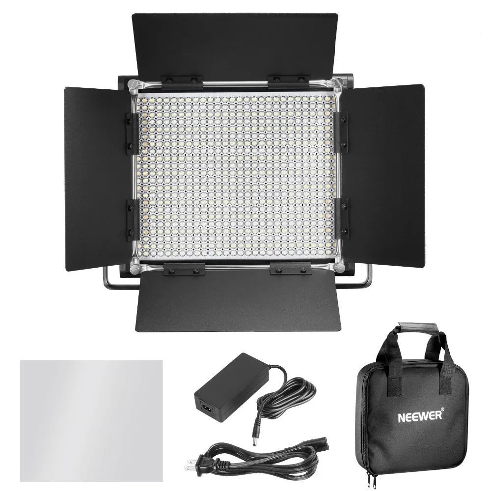 The light is powered by AC Adapter (included) or NP-F550 NP-F970 Li-ion battery(not included); Attaching barn doors to light sources creates a beam spread of light; Comes with a white diffuser to soften the harsh light and a carrying bag to store the light and accessories
