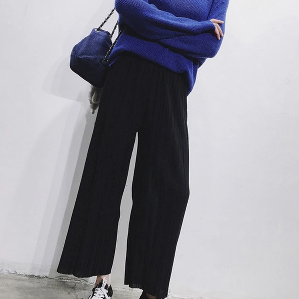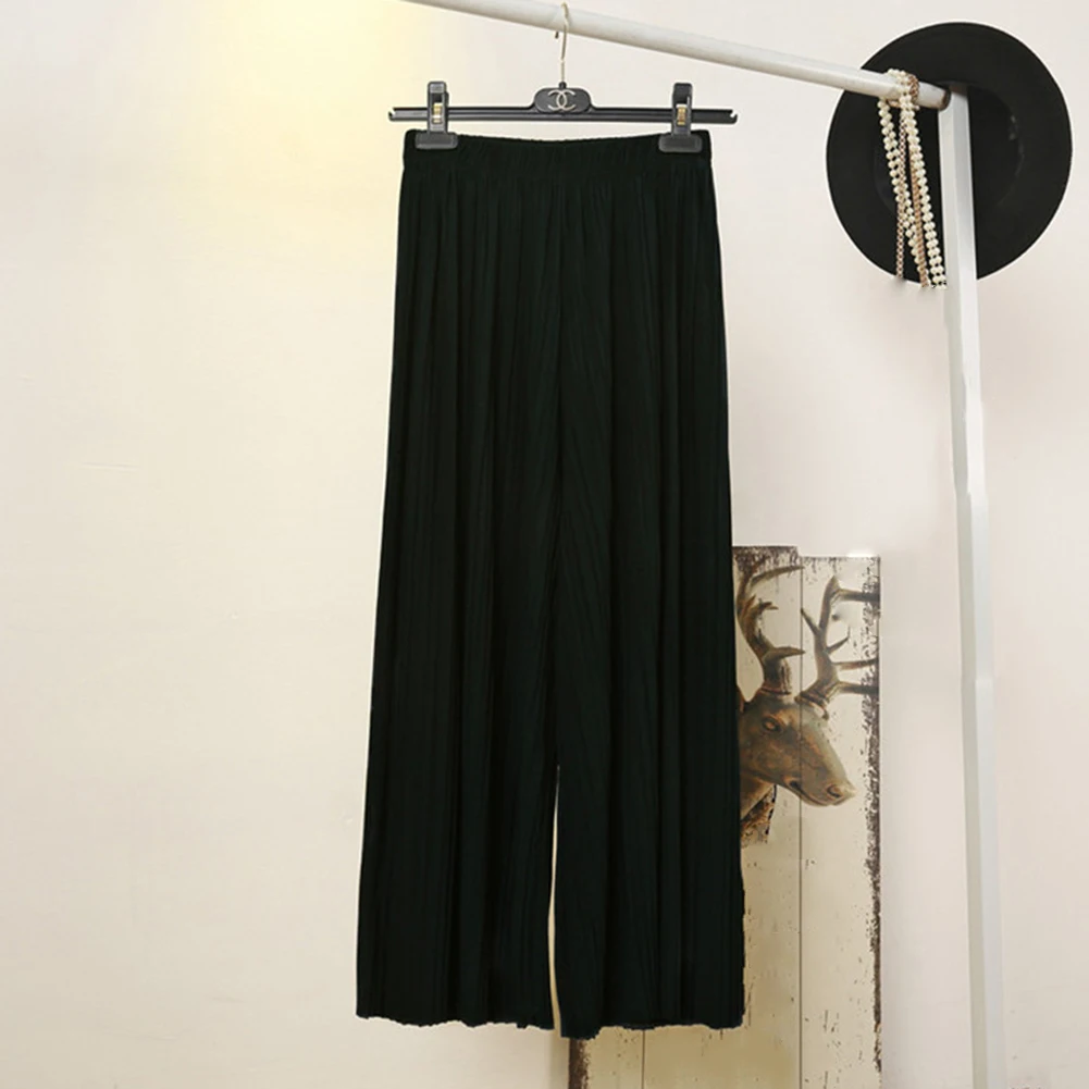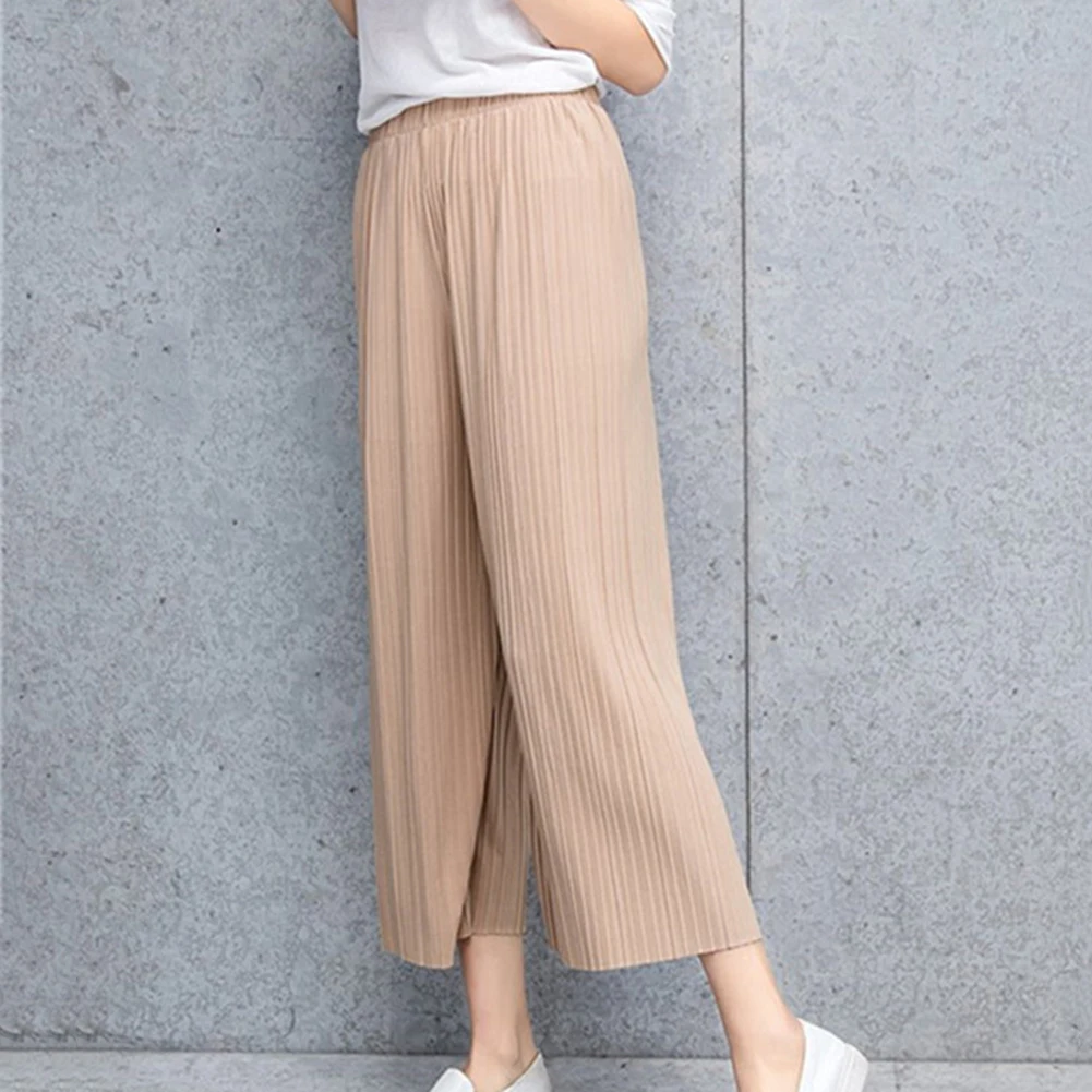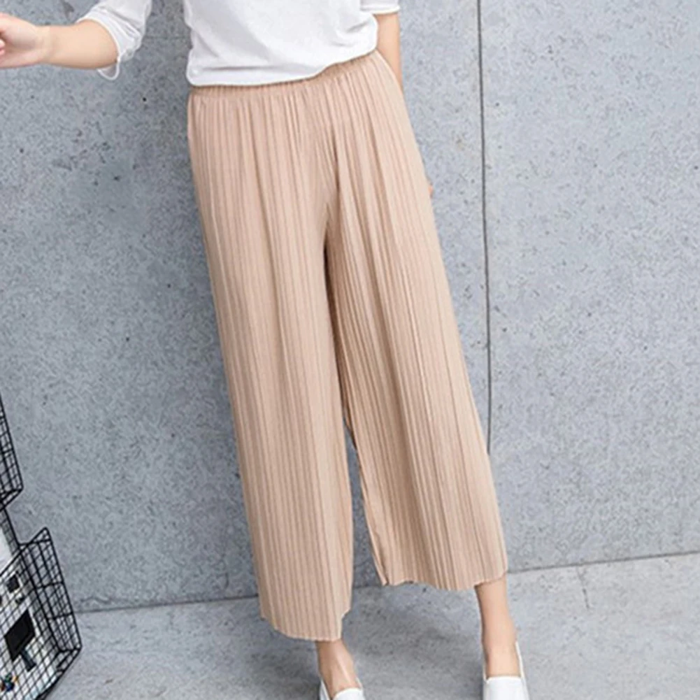 Женские однотонные плиссированные широкие брюки с эластичной резинкой на талии, укороченные брюки-кюлоты