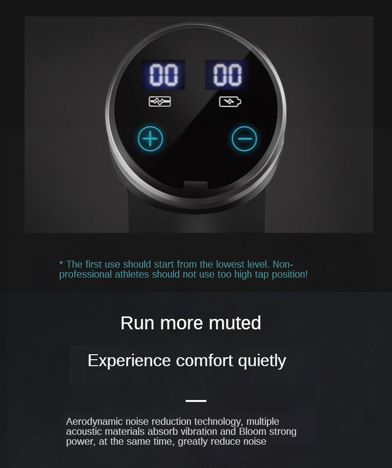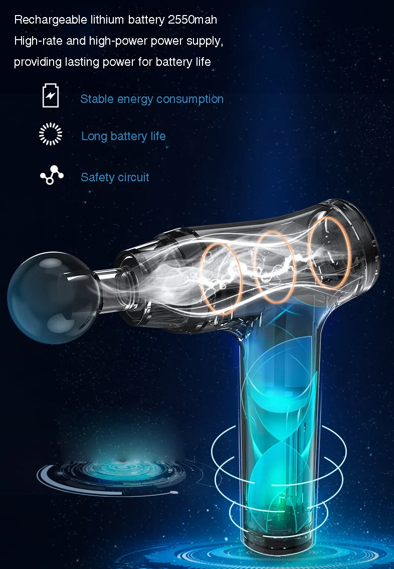 -Снимает жесткость и болезненность: массажер используется для облегчения мышечной жесткости и болезненности, способствует кровообращению и лимфатическому кровообращению, ускоряет восстановление после спортивных и спортивных травм, улучшает общее здоровье мягких тканей организма и предотвращает спайки между фашией и фасцией и воспаление, вызванное мышцами. -Высококачественный двигатель: Массажер имеет высококачественный двигатель с функцией сверхтепловыделения. Плавное скольжение может эффективно уменьшить шум во время работы. 45DB бесшумный массажа. -Быстрая зарядка: массажер оснащен высококачественной литиевой батареей емкостью 2500 мАч, которая может работать от 5 до 6 часов после каждого заряда и может быть быстро заряжена. -30 скоростная Регулировка вибрации. Эффективный массаж для расслабления мышц. Примечание: пожалуйста, выключите питание под ручкой после использования, чтобы сделать батарею более прочной.
