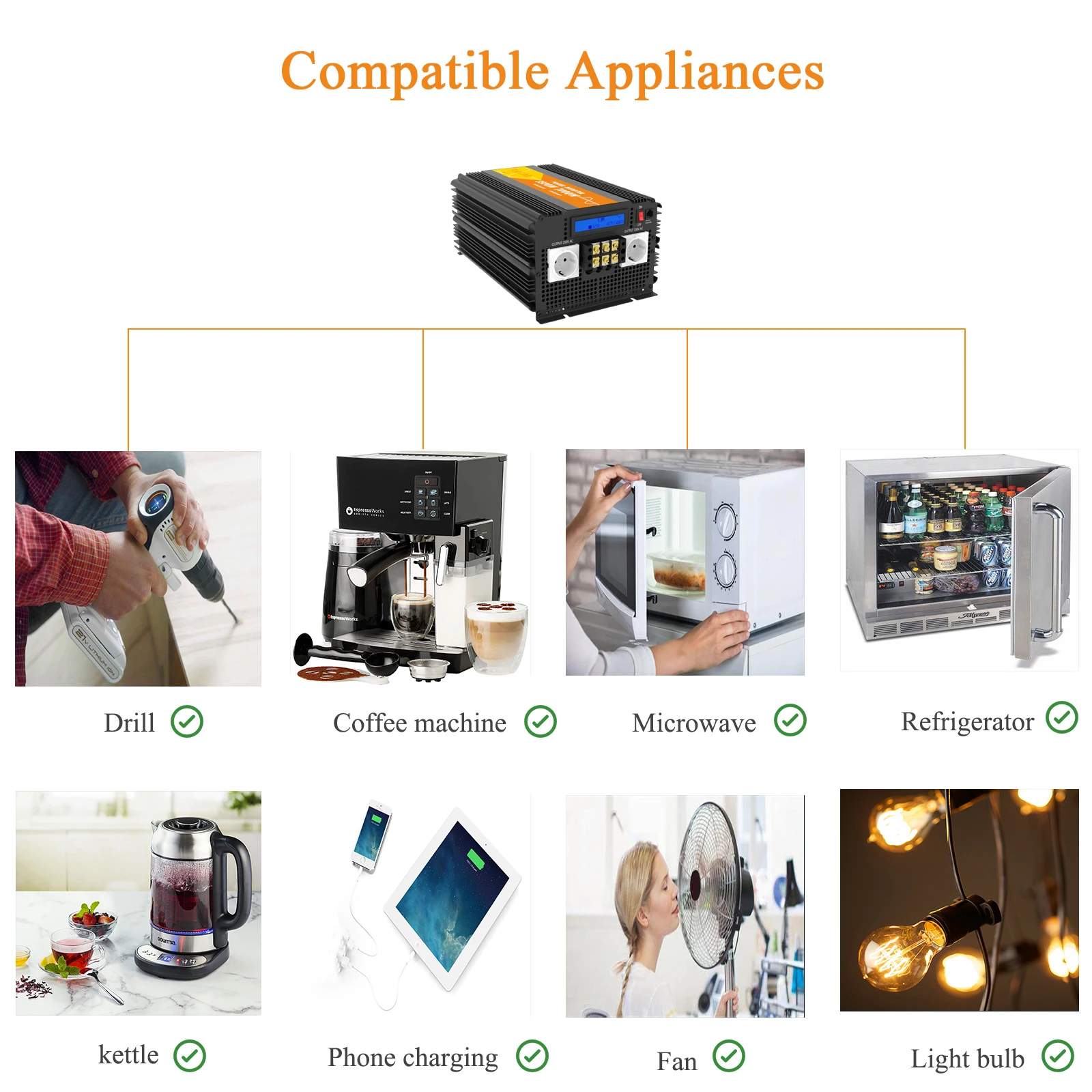 Инвертор постоянного тока в переменный инвертор 12V 230V мы можем доставить 3500 Вт Номинальная мощность/7000W Макс пиковая мощность. Движимый однополярный SPWM, выход синусоидальной формы чище, THD<3%, нижняя электромагнитных помех. Идеально подходит для питания вашего чувствительной электроники, таких как лазерная струйных принтеров, компьютеры, смартфоны и другие важные оборудования.