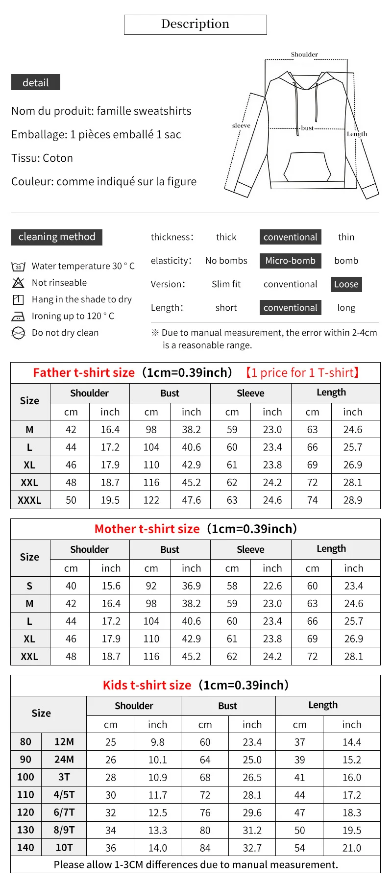 Примечание: футболки для папы, мамы и детей отличаются по цене.Одна цена за одну футболкуНазвание продукта: Семейные футболкиВес: около 0,12-0,3 кг/шт.Ткань: 95% хлопок, 5% спандексУпаковка: 1 шт упаковано в 1 мешокЦвет: черный, синий, красный, оранжевый, желтый, серый, белыйРазмер папы: M-L-XL-XXL-XXXLРазмер для мамы: S-M-L-XL-XXLДетские Размеры: 80(12M), 90(24M), 100(3 т), 110(4 т), 120 (T/5T/6T), 130(7T/8T), 140(9T/10T)