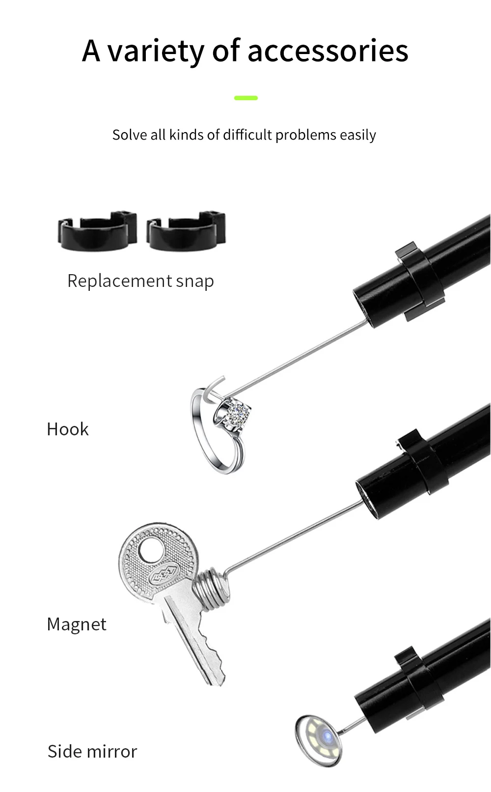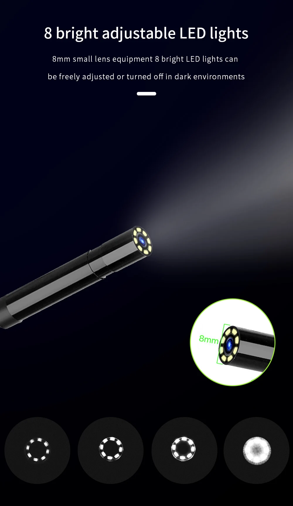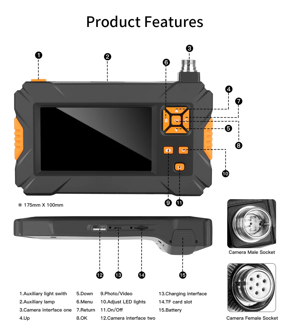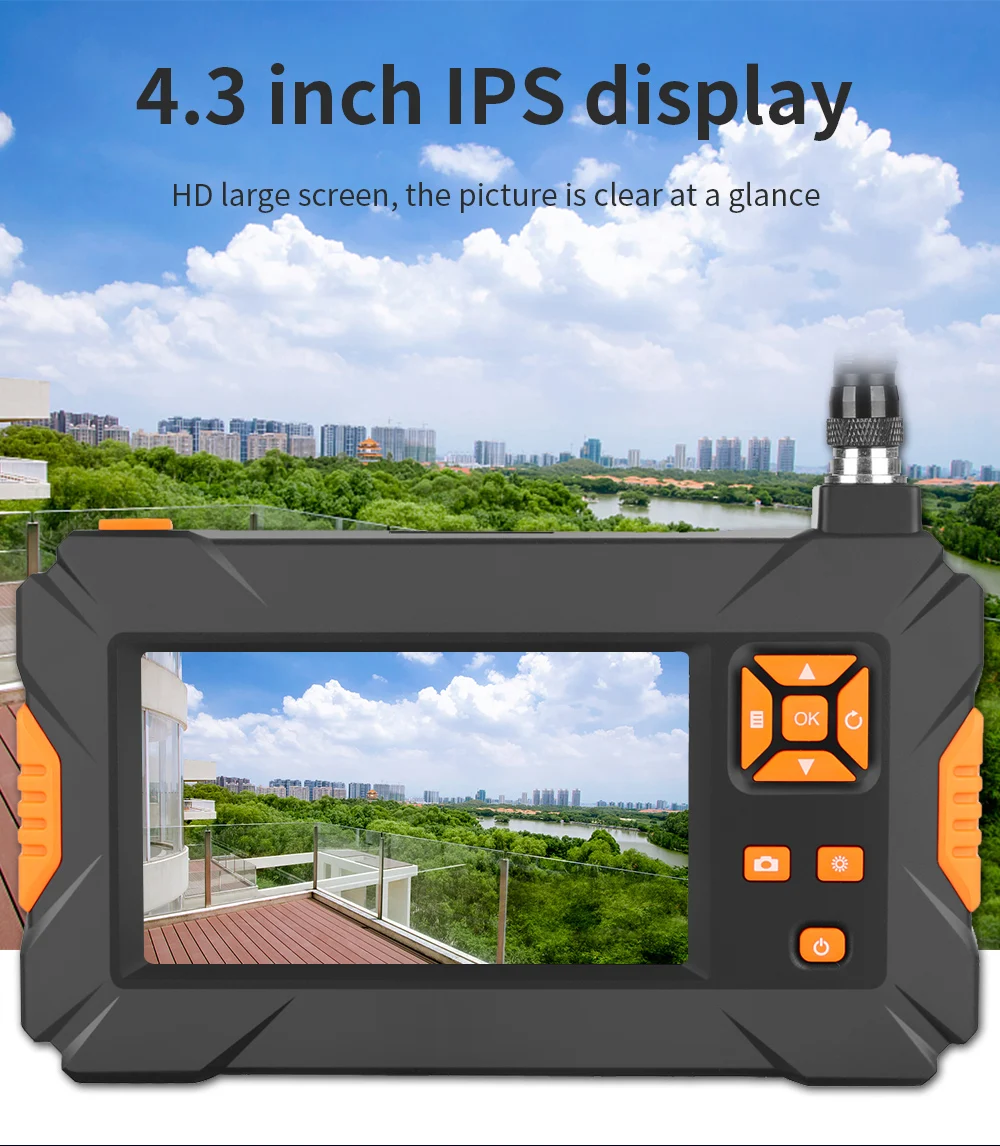 Особенности: 1.4.3 дюймовый полноцветный ЖК-экран, который может просматривать тестовое видео в режиме реального времени 2. Разрешение до 1080p для захвата изображения и записи видео. 3,360 вращение изображения. 4. Tf-карта может быть установлена для реализации функции хранения файлов. 5 высокочувствительная водонепроницаемая камера, четкое качество изображения, подходит для различных условий работы. 6. Специальная технология, фокусное расстояние 4 см 500 см. 7. Регулируемый светодиодный светильник и флэш-светильник для использования в темной среде. 8. IP67 водонепроницаемый Список аксессуаров: 1. ЖК-цифровой эндоскоп 2 Руководство пользователя 3. Линия зарядки 4. Аксессуары-крюк, магнит, боковое зеркало
